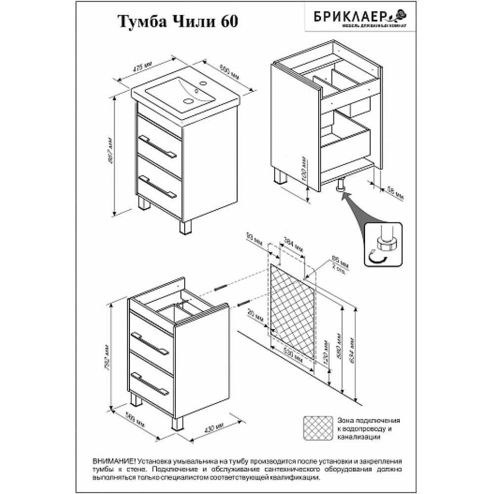 - Тумба с раковиной Бриклаер Чили 60: раковина Комо 60, выдвижной ящик - 2 шт., ручка - 2 шт.