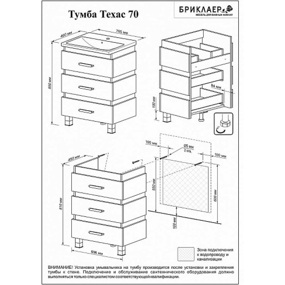- Тумба с раковиной Бриклаер Техас 70: раковина Фостер 70, выдвижной ящик - 3 шт., ручка - 3 шт.