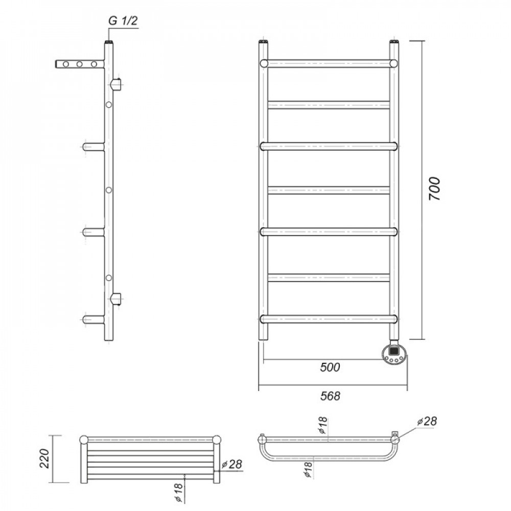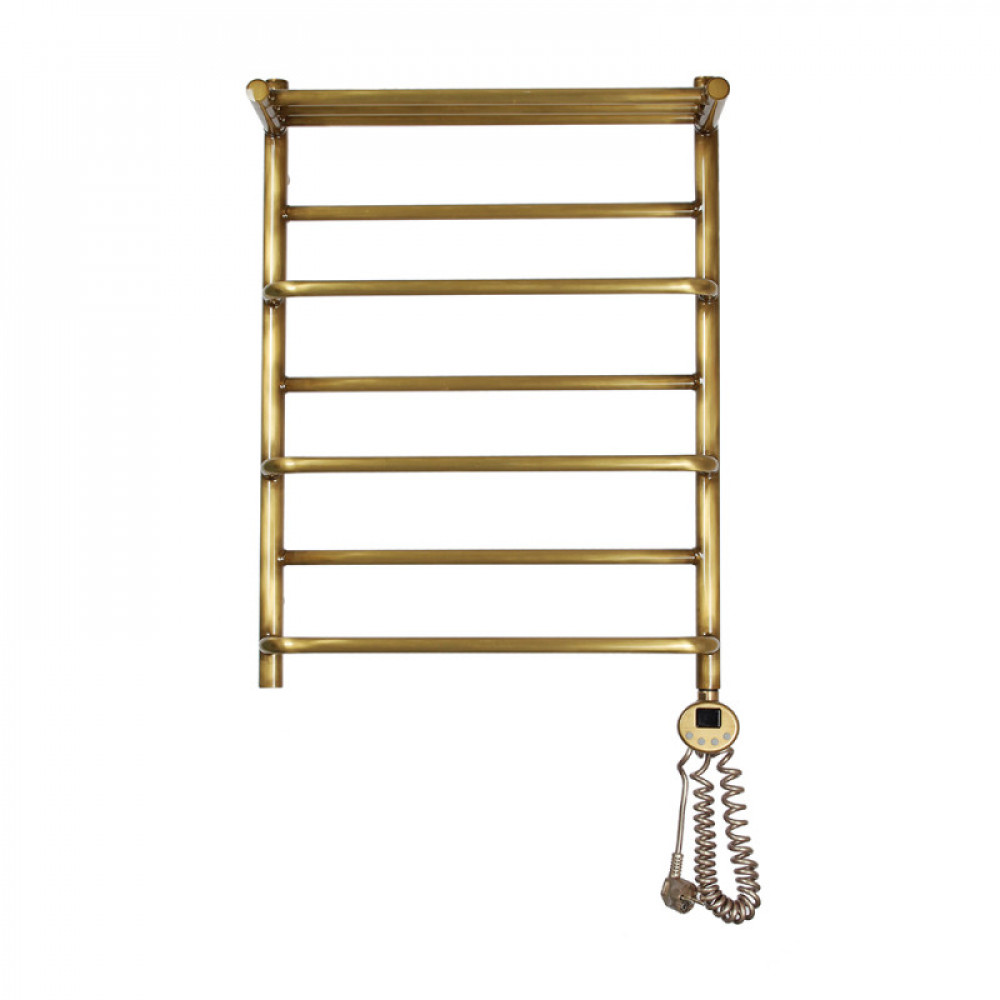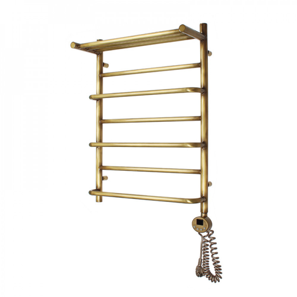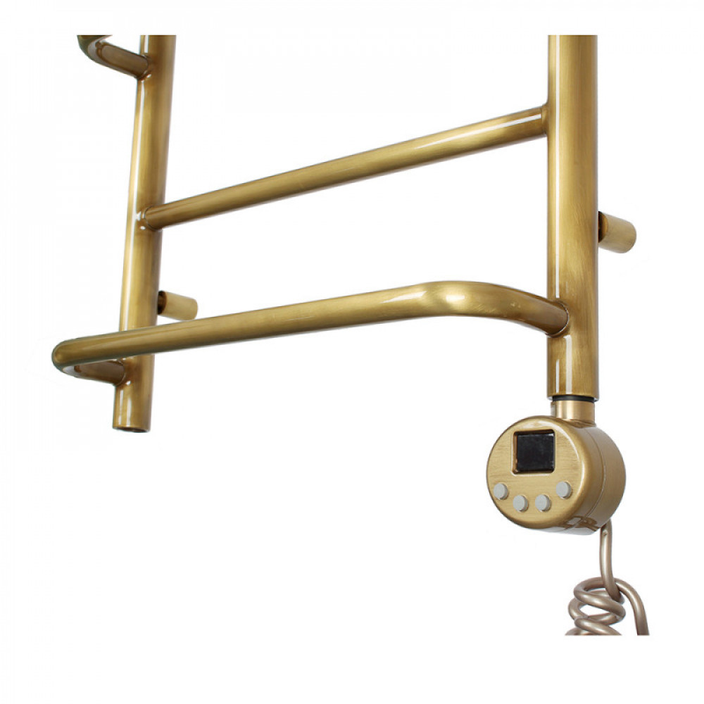 Электрический полотенцесушитель из латуни марки Л59. Цвет «Античная бронза». Труба цельнотянутая. Вертикальные стойки имеют диаметр 28 мм., горизонтальные перекладины выполнены из трубы диаметром 18мм. ТЭН имеет цифровой терморегулятор, температура регулируется от 35 до 70 градусов. Встроен таймер автоотключения на 2 и 4 часа. ТЭН оснащён термодатчиком, который защищает устройство от перегрева. Поставляется в сборном виде. Возможно скрытое подключение.